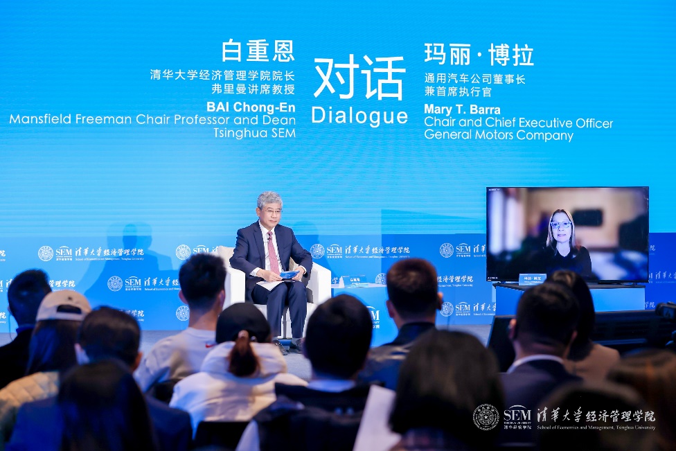 白重恩首先简要介绍了玛丽·博拉。在过去36年里,玛丽·博拉从车间实习生一路成长为通用汽车CEO,展现出卓越的领导力、战略眼光、推进变革的决心和处理危机的能力。作为学院顾问委员会委员,她多年来始终积极为学院发展建言献策。随后,两位嘉宾围绕当前全球变革、产业创新和人才培养等话题展开深入交流。