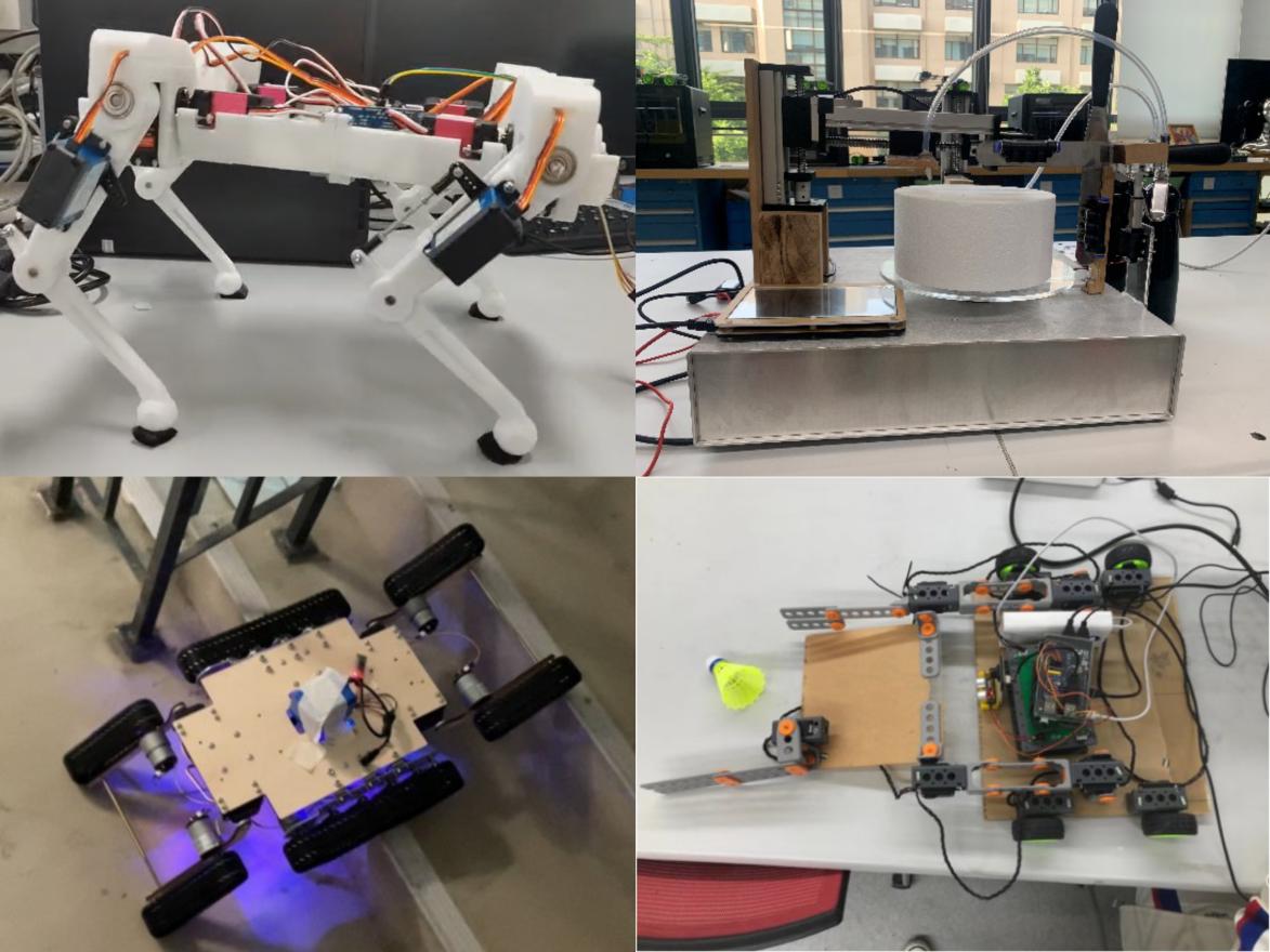 参加课程的25名同学组成了10支参赛队,完成了羽毛球捡球机器人、机器狗、避障引导机器人、全自动蛋糕机器人等10个项目。各参赛队对成果进行了逐一展示。