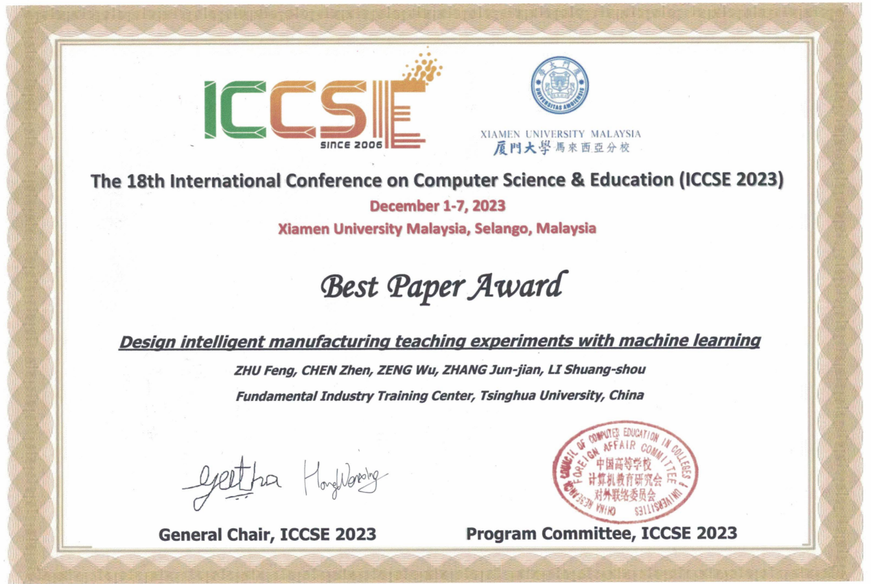 AG(中国)AG·官方网页版网1月10日电 第18届国际计算机科学与教育会议(IEEE the 18th International Conference on Computer Science & Education,IEEE ICCSE 2023)近日在马来西亚举行。AG(中国)AG·官方网页版基础工业训练中心教师朱峰、陈震组成跨学科交叉团队,在基础工业训练中心主任李双寿的指导下,基于实践教学研究形成的论文“使用机器学习设计智能制造教学实验”(Design Intelligent Manufacturing Teaching Experiments with Machine Learning)获得最佳论文奖(Best Paper Award)。