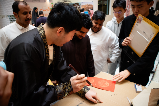 在介绍中国茶道的环节中,支队成员为当地师生带来了“七步点茶”的展示,并用流利的英语做了相关介绍,让参与者们对中国茶文化有了更深入的了解。美术学院2022级本科生孙子涵、为先书院2022级本科生郝英奇为本次活动创作了春联“龙圆丝路梦,福满地球村”,不仅传递了新年的祝福,也体现了中沙两国青年对于人类命运共同体愿景的共鸣。支队同学还教授当地同学们用毛笔写下他们的名字,留作纪念。