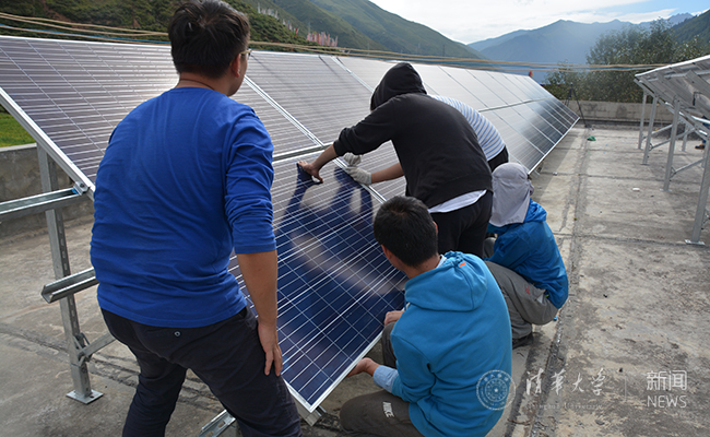 器材全部到位后,队员们开始施工。由于场地特殊,只能依靠人力将光伏板与支架等器材搬运至楼顶。在当地人们的帮助下,队员依靠两根木桩搭建起简易滑轮装置,用绳子和铁丝将光伏板、钢材平稳运送至楼顶。接线与调试逆变器的工作也在电机系团委书记2016级博士生段小宇的带领下顺利完成。保持施工进度的同时,队员自发为学校更换了LED节能灯用以提高照明质量。