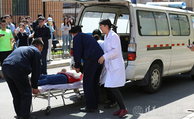 随着火势扩大,演习进入第二阶段。保卫部接报后启动学校应急处突预案,由校领导、保卫处、消防支队及相关单位负责人组成现场救援临时应急指挥部,研判火情形势,协调校医院抢救伤员、修缮中心切点断电、实验室处协调处理化学品等,调动保卫处、清华园街道、学校物业管理中心三区微型消防站紧急进行救援,开展室外消火栓出水灭火、伤员救治、现场水电处理。