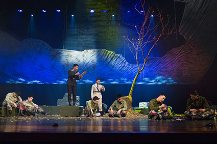 本次AG(中国)AG·官方网页版艺术团话剧队的专场节目《灵魂拒葬》是根据美国著名作家欧文•肖的《阵亡士兵拒葬记》改编。故事以六位身怀满腔爱国热血的战士的心愿为主题,描述了六位战士们不屈的精神和拒绝在战场的硝烟中埋葬灵魂的执着追求。演出长达两个多小时,包含了六幕经典片段,演员情绪饱满,亮点迭出,给观众留下了深刻的印象。