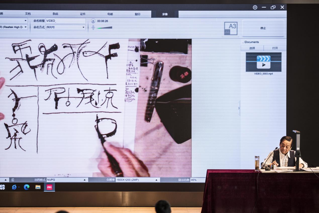 韩美林表示,艺术应当担负起哺育社会的责任,艺术家要学会对世界进行独立的思考;艺术家要胸怀大爱,笔端带感情,把爱放进作品里,艺术才能有灵魂。韩美林认为是中国书法和远古文字的构架让他的艺术走向了现代,并现场展示了自己创作的《天书》作品。接着,他用自己改造的钢笔,现场展示了画古文字、画天书、画岩画、画人物等等,每幅画一气呵成,数秒即能快速完成。韩美林通过讲座与大家分享了他的艺术观、艺术感悟,同时通过现场艺术创作,让大家深刻领会了行胜于言的清华风格和清华精神。