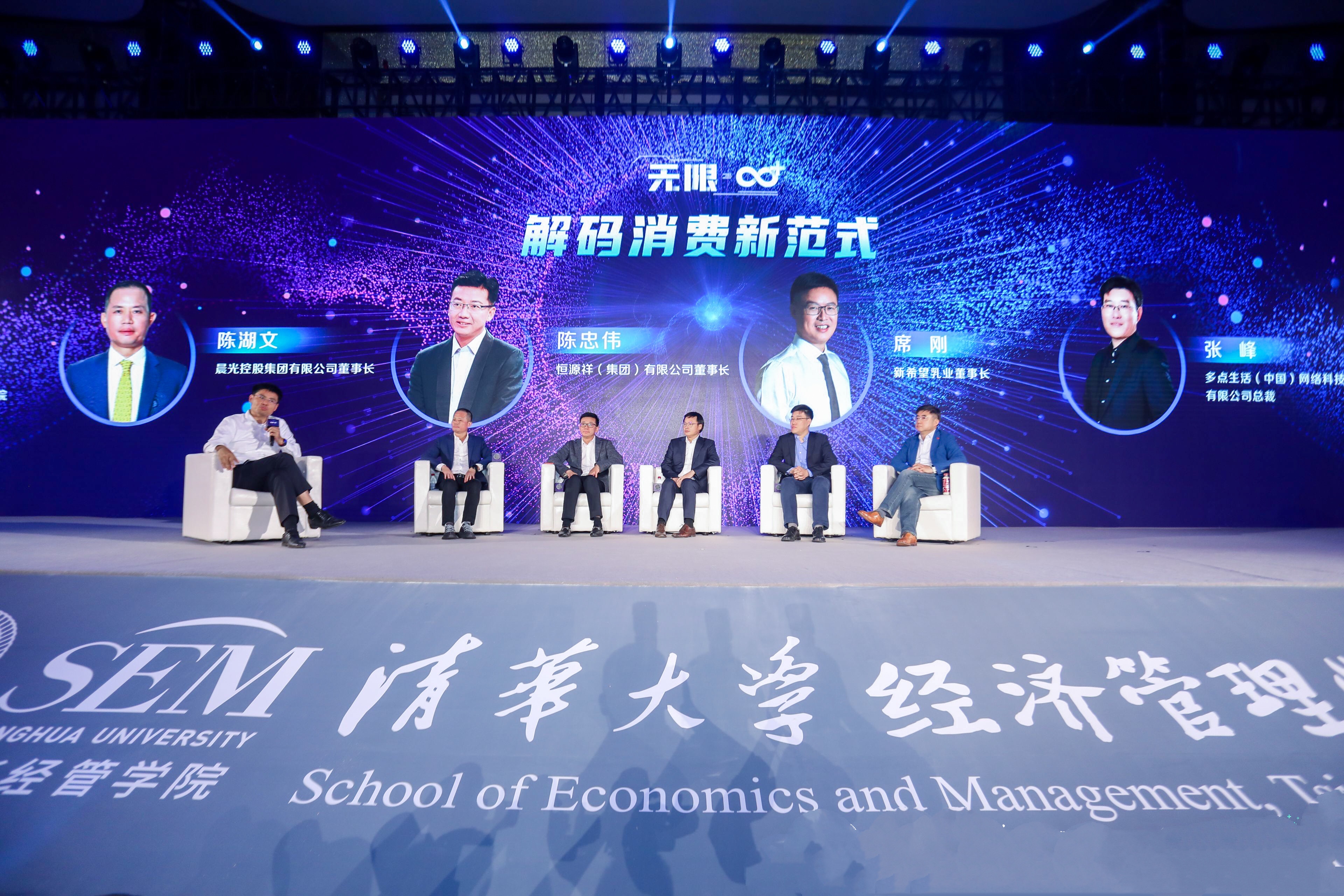 清华经管EMBA校友、晨光控股集团有限公司董事长陈湖文,“清华-阿里新商业学堂”一期学员、恒源祥(集团)有限公司董事长陈忠伟,“清华-青腾未来科技学堂”二期学员、新希望乳业董事长席刚,“清华-阿里新商业学堂”一期学员、多点生活(中国)网络科技有限公司总裁张峰,清华经管EMBA校友、可口可乐大中华及蒙古区副总裁张建弢在“解码消费新范式”论坛中就新消费时代的机遇和挑战进行了深入探讨。