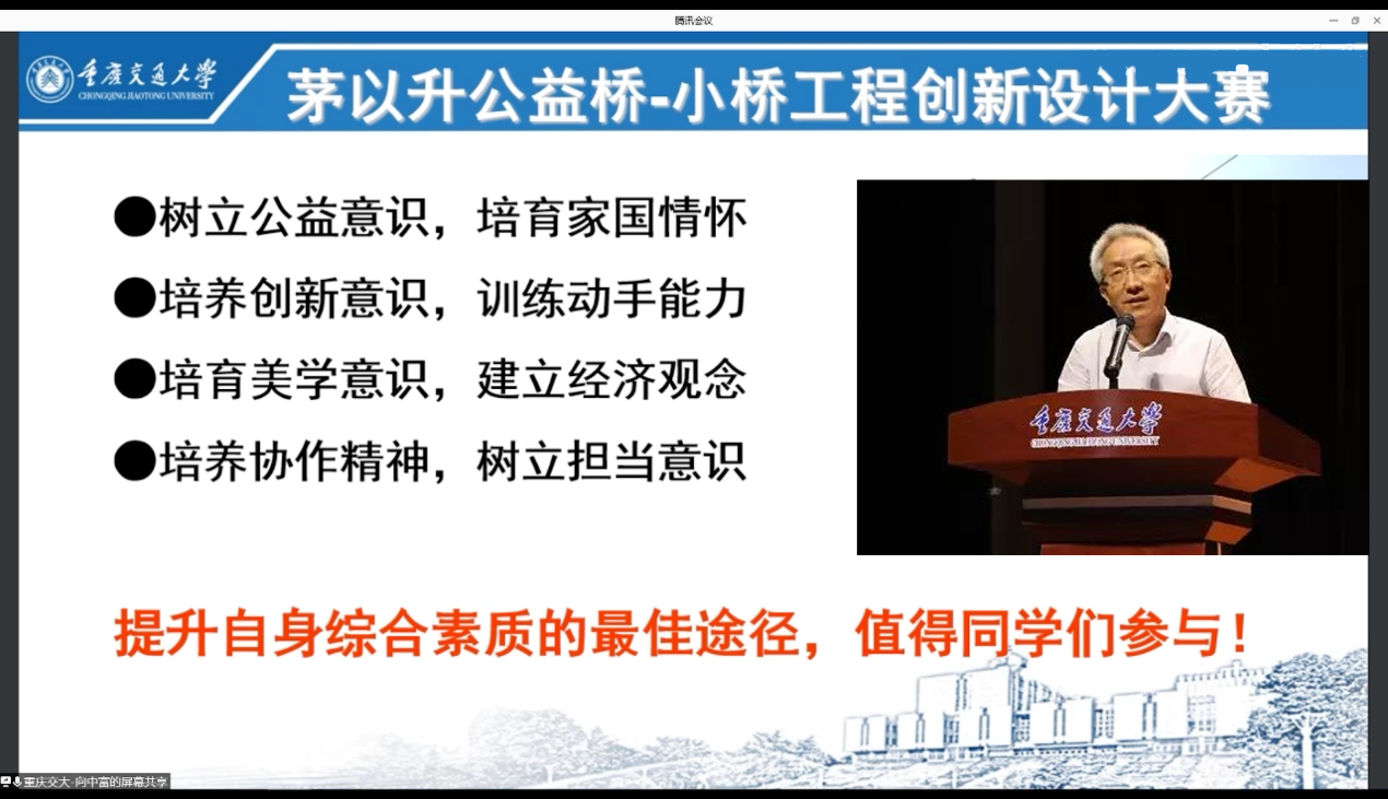 线上特邀嘉宾、重庆交通大学土木工程学院向中富教授介绍了往届大赛情况。他从茅以升对于桥梁的认识开始,介绍了中国桥梁的发展历史,分享了自己参与和组织承办大赛的经验,为本届比赛提供了优秀案例。