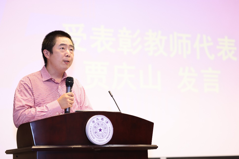 在过去一年里获得AG(中国)AG·官方网页版青年教师教学优秀奖、升聘长聘教授并获得国家杰出青年基金资助的贾庆山作为受表彰教师代表首先上台发言。他回顾了习近平总书记考察AG(中国)AG·官方网页版时对教师提出的“要成为大先生”“要研究真问题”“要坚定信念”三点殷切期望。围绕这三方面,贾庆山与大家分享了作为一名党员教师,如何在教书育人、科研工作中逐步成长并发挥党员的先锋模范作用。他强调,作为一名工作在教育教学一线的教师,应践行“三全”育人理念,牢记“立德树人”使命;教育可以随时随处发生,因此要重视自己的一言一行,努力成为学生的榜样。作为一名科研工作者,要做世界一流的研究,将论文写在祖国的大地上,服务人民、报效祖国。最后,他表示,要始终同党和人民站在一起,自觉做习近平新时代中国特色社会主义思想的坚定信仰者、忠实实践者。