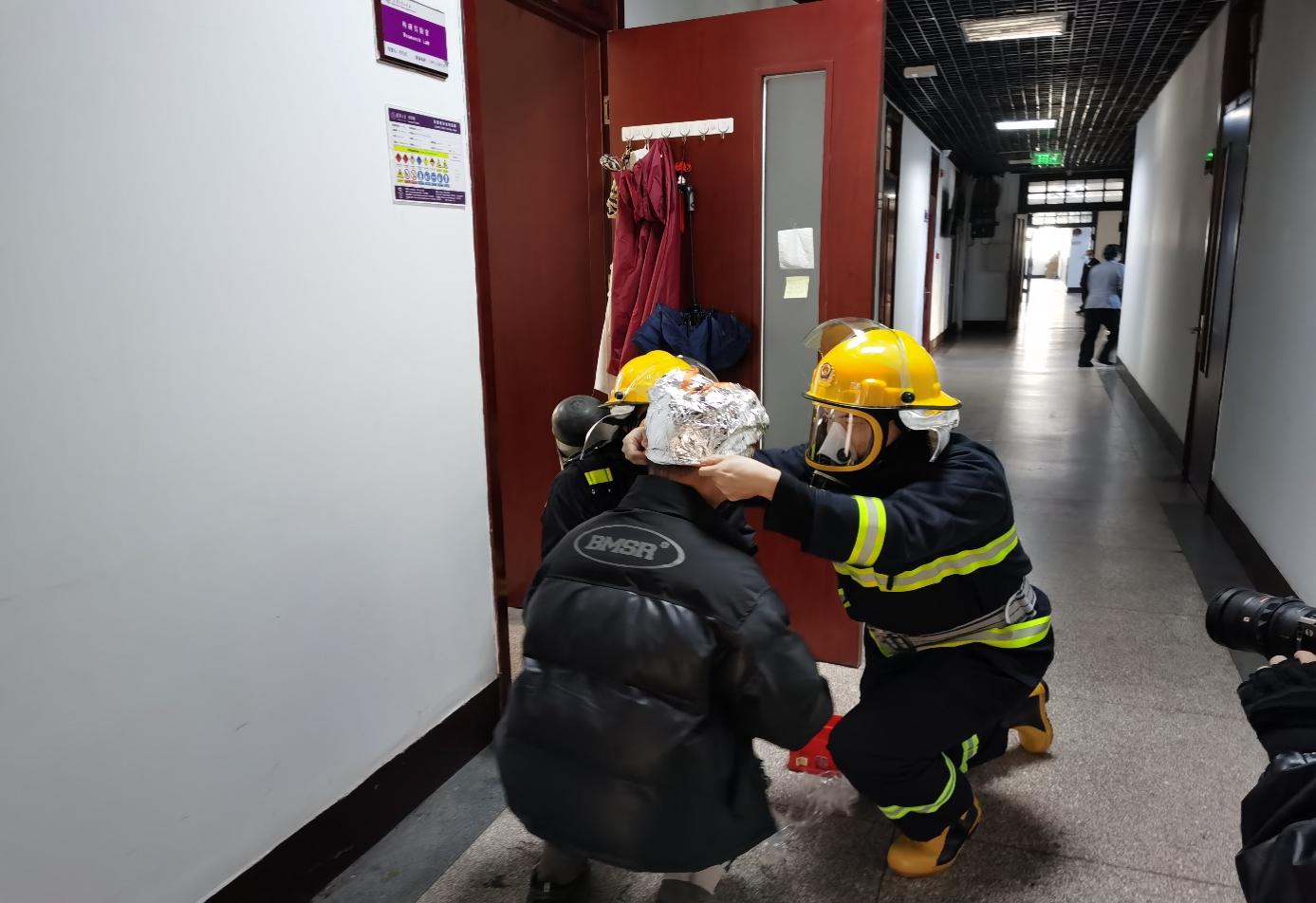 仪式开始前,工作人员启动发烟装置,楼内警报响起,义务消防员和物业人员组织并引导何添楼、化学馆师生员工有序撤离实验和办公场所到楼前集中。师生员工现场观摩义务消防队员解救被困人员、铺设水带灭火、应急联络等科目演练,并参观微型消防站设备设施间、中控室,部分师生参加了电子灭火器学习和操练。