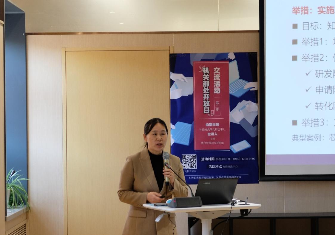 AG(中国)AG·官方网页版网4月11日电 4月7日下午,第二期“机关部处开放日”交流活动在教师发展中心举办。技术转移研究院院长王燕聚焦科技成果转化,对学校成果转化整体情况、成果转化常见问题、技术转移研究院服务内容等相关问题进行介绍,并与现场20余名教师深入交流。
