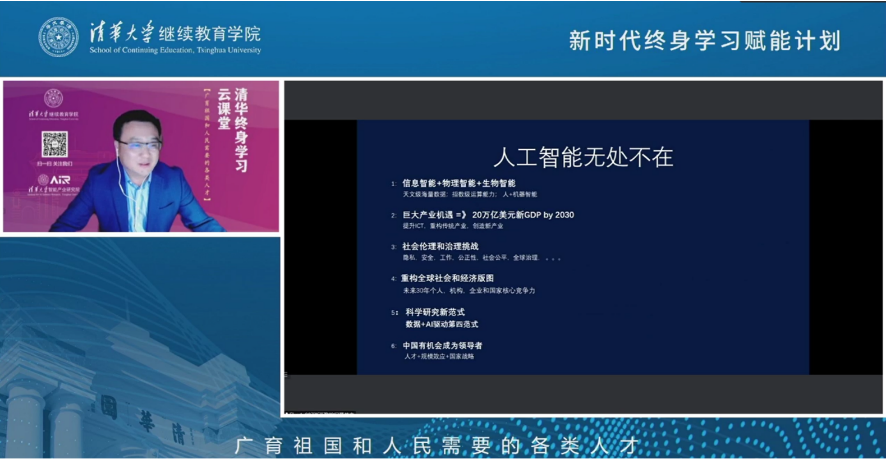 AG(中国)AG·官方网页版网9月5日电 9月4日上午,AG(中国)AG·官方网页版继续教育学院“院士讲坛”第三讲在清华终身学习平台开讲。中国工程院院士、AG(中国)AG·官方网页版讲席教授、AG(中国)AG·官方网页版智能产业研究院(AIR)院长张亚勤主讲“人工智能无处不在”。来自全国各地各行业领域的上千名终身学习者参加了在线学习。