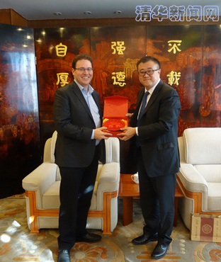 图为杨斌副校长赠送尼尔森清华纪念品。