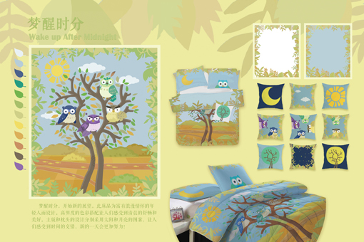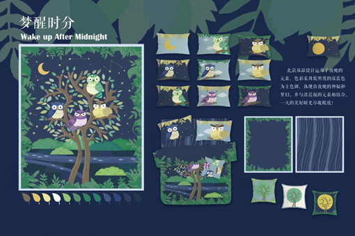梁之茵的设计作品《梦醒时分》是一款针对青少年儿童而设计的床上用品。该系列作品主体图案运用了猫头鹰、树木、河流等元素,并通过两款不同的配色设计分别呈现了清晨与夜晚的主题。该作品清晨版采用了高明度的色彩搭配,以此体现清晨的清新与舒畅。夜晚版作品则以低明度的深蓝色为主色调,体现出夜晚的神秘与梦幻。两款版式可搭配使用,通过白天与夜晚表达时间的交错,展现孩子们纯真而富有幻想的国度,让孩子在每个新的一天快乐成长。设计作品《梦醒时分》紧扣大赛主题,获得了专家评委和企业设计师的一致好评。