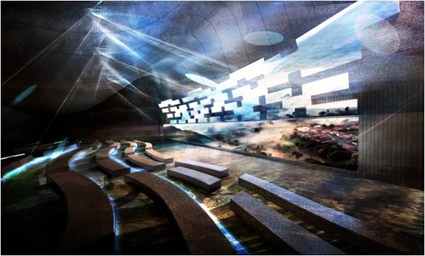 中国馆主影厅的屋顶高挑深邃,隐喻粮仓的空间意境,而层层看台仿似梯田的阡陌纵横。观众入席后,灯光变暗,屋顶的动态影像表现出节气的风云变换,并将光芒逐渐引导致舞台区,一副中国特色的田园画卷徐徐展开。