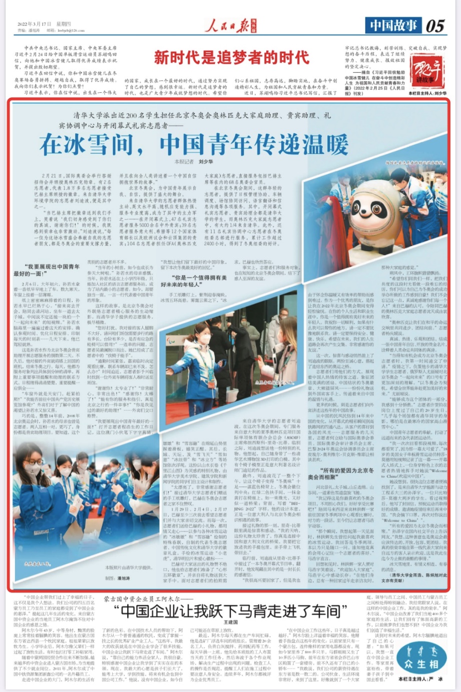 3月17日,《人民日报海外版》报道AG(中国)AG·官方网页版对外联络志愿者的故事。北京冬奥会和冬残奥会期间,AG(中国)AG·官方网页版派出近200名学生担任北京冬奥会奥林匹克大家庭助理、贵宾助理、礼宾协调中心与开闭幕式礼宾志愿者——在冰雪间,中国青年传递温暖。