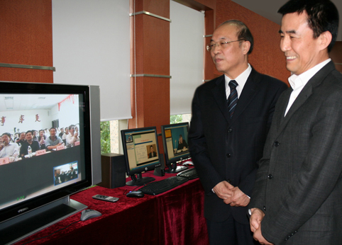 2009年4月,中组部副部长王尔乘、时任清华继续教育学院院长胡东成与四川古蔺教学站远程对话。