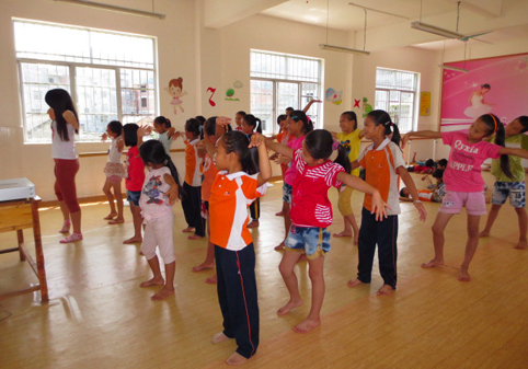 图为赴广西百色市田东县祥周镇关爱留守儿童支队队员教小朋友跳舞。