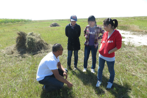 图为赴吉林省白城市什花道乡岭上村调研及实践支队跟随草原站工作人员查看草种发芽情况和长势。