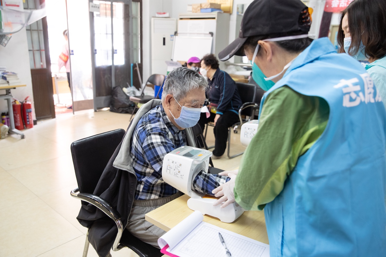 校医院退休大夫陈老师作为志愿者,正在帮助和接待前来接种疫苗的老同志