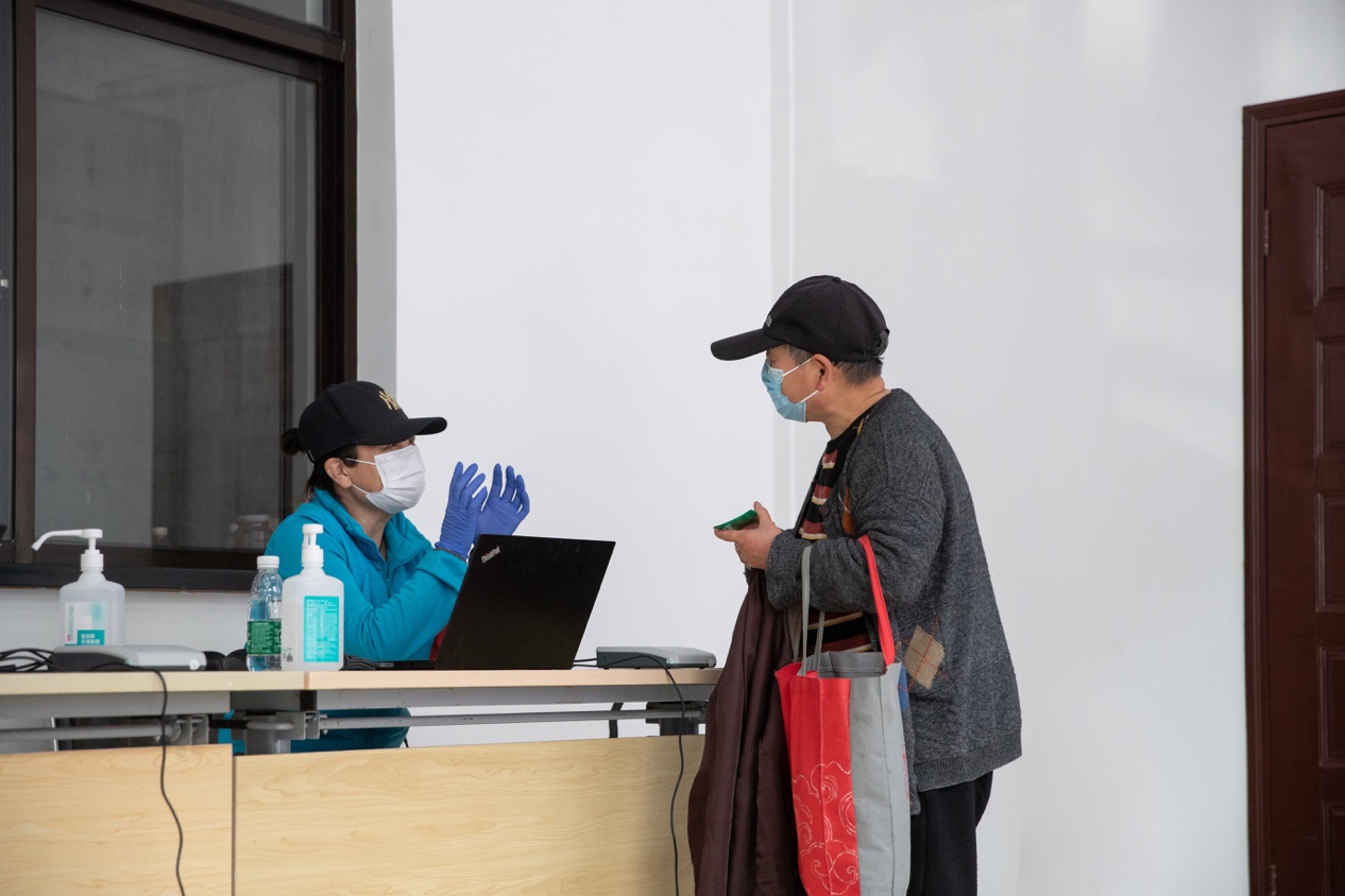 在社区志愿者的细心引导下,工作人员为老同志做好登记