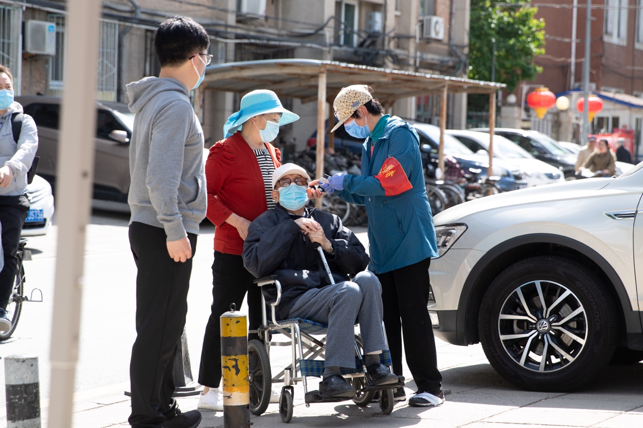 留观时间结束后,老同志在志愿者的引导下离开,完成疫苗接种
