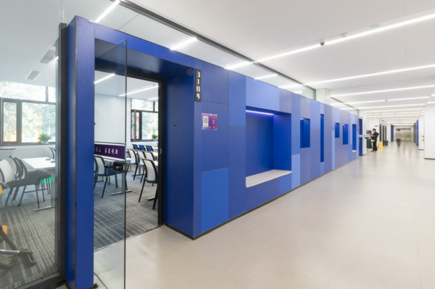 局部退进教室的隔墙将原本的走廊扩展为别具一格的“彩色盒子”,打造出开放的学习场域。