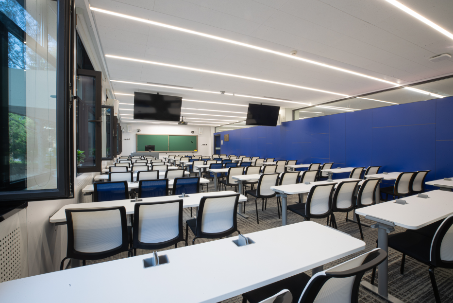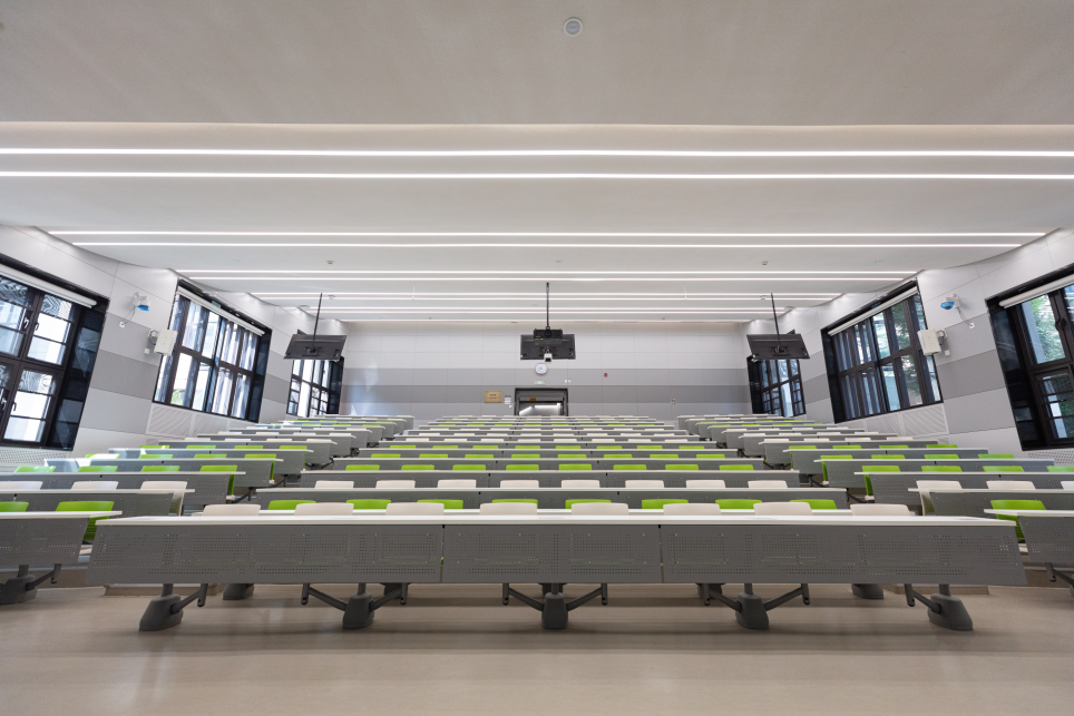 二段一层的阶梯教室里,白色与绿色隔行错落的座位与四周不同灰度的墙面相呼应,给予这间教室以极高的辨识度。