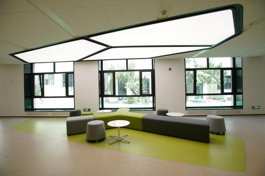 细节上,字牌、墙面和灯光的设计,都体现了建筑空间的一体化。三段与一段的教室门牌字体一个如盒子方正,一个由折线贯通;地毯也分别呈方形和线形,与椭圆形、钻石形的灯光相映成趣。