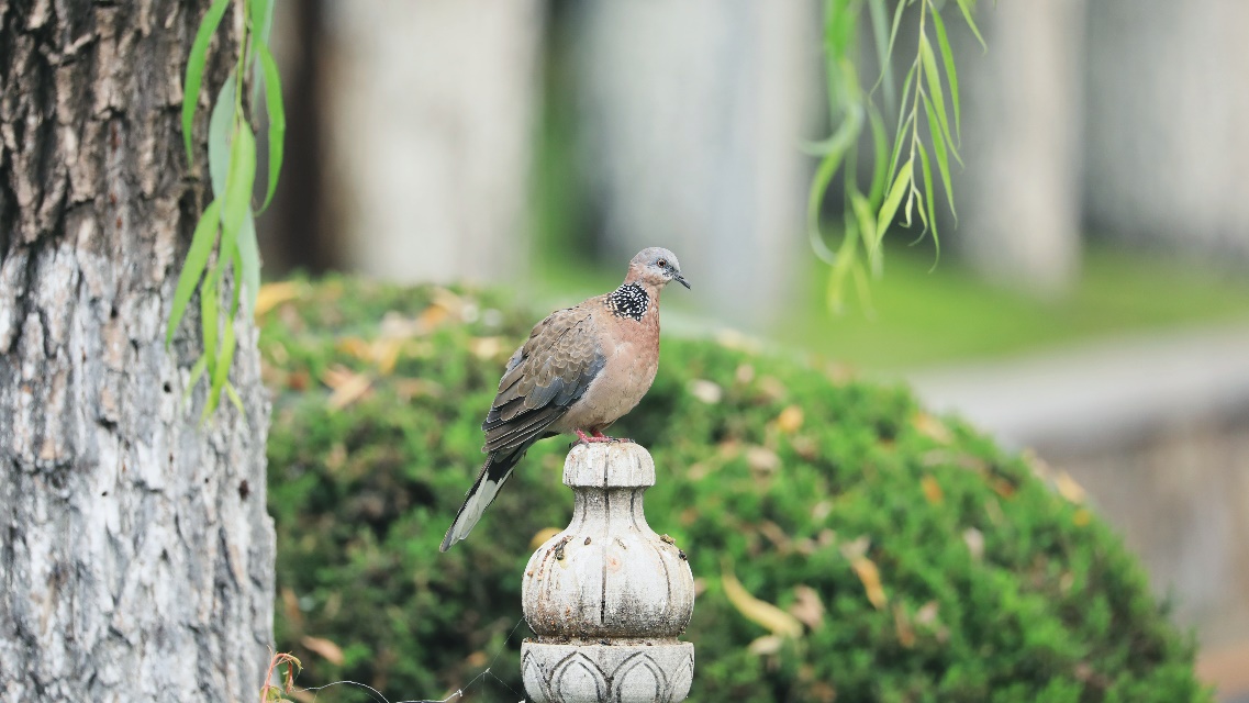 除了戴胜,在草地上捡拾植物种子的珠颈斑鸠和山斑鸠也很是常见。