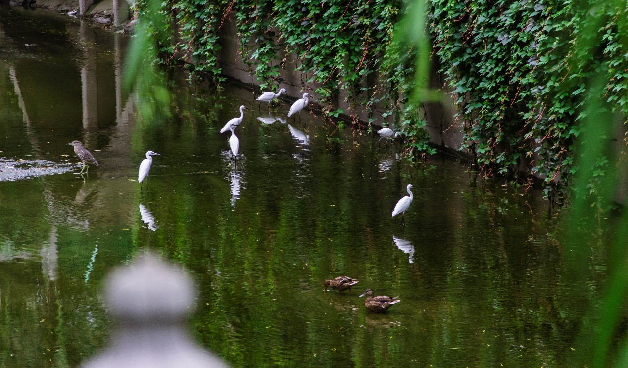 不远处,还有鸳鸯和绿头鸭,没有了春季时的漂亮羽色,朴朴素素地享受着夏日的校河。