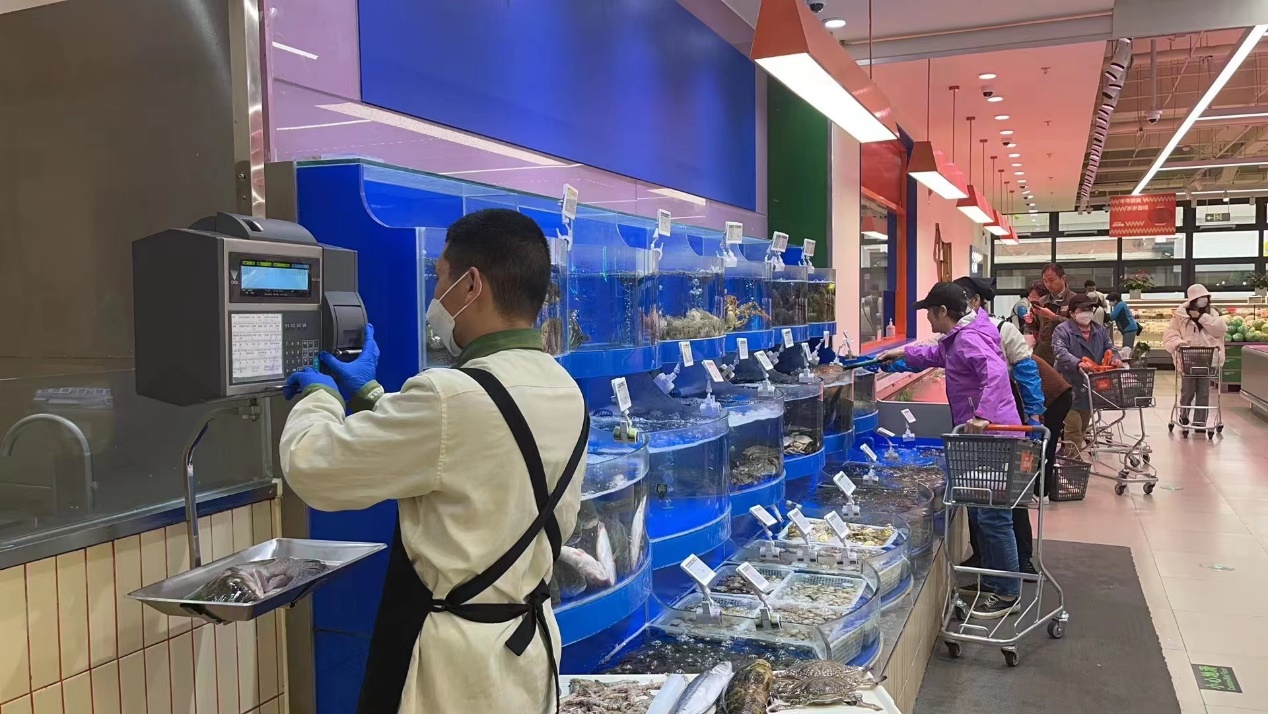 超市工作人员在水产区服务顾客
