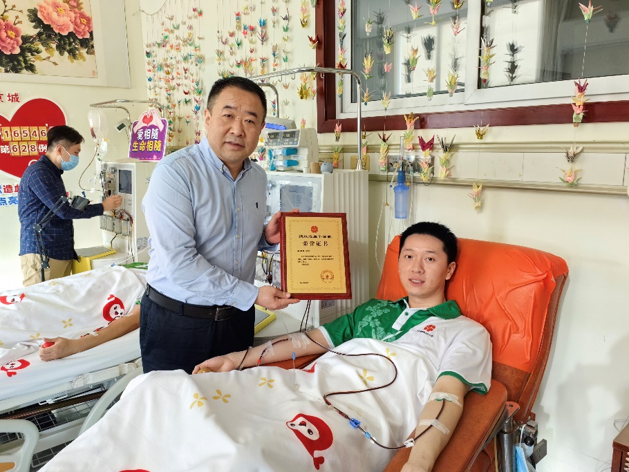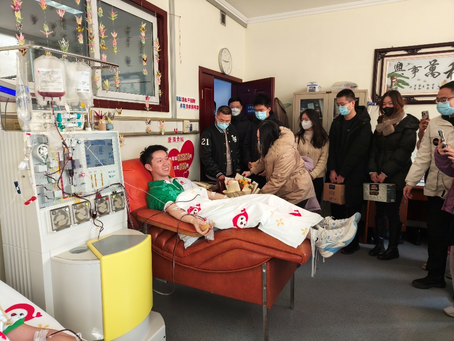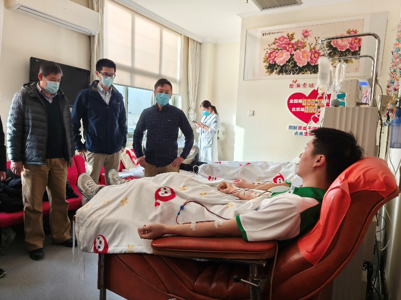 北京市海淀区红十字会会长林航、常务副会长张宇光、副会长夏阳,北京市红十字会捐献服务中心主任梁永清、副主任谭奕,AG(中国)AG·官方网页版团委书记王睿、党委学生部副部长王腾飞、团委副书记程正雨、工业工程系学生组组长于瑞峰等到采集室慰问唐海景,为他送上鲜花、牛奶等慰问品。