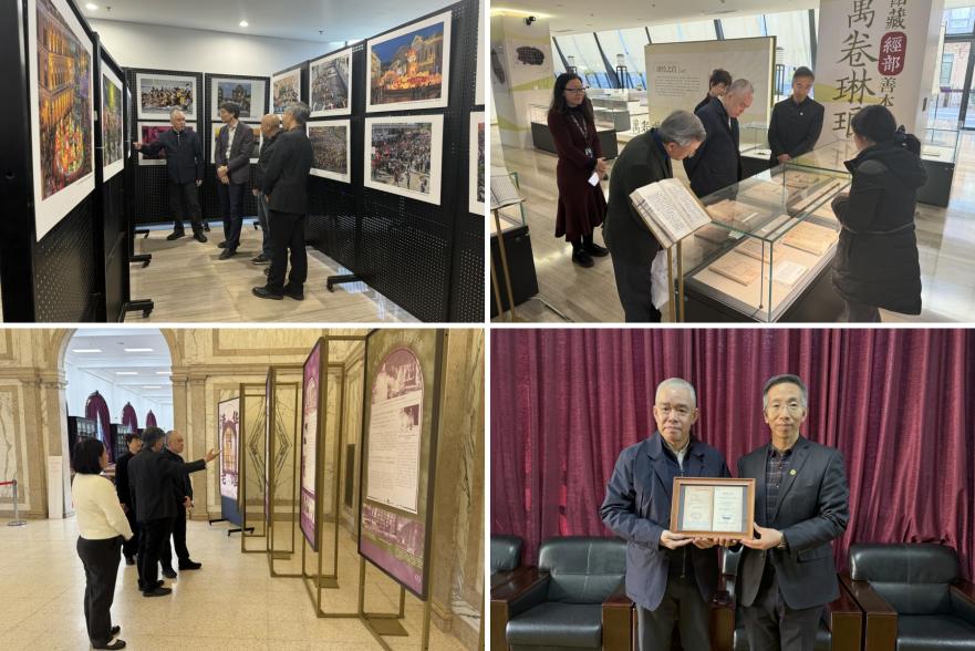 开幕式后,澳门科技大学一行参观了摄影展、万卷琳琅——馆藏经部善本特展及图书馆老馆。金兼斌向唐嘉乐赠送了馆藏编号No.3西文图书(唐国安先生捐赠)影印纪念。