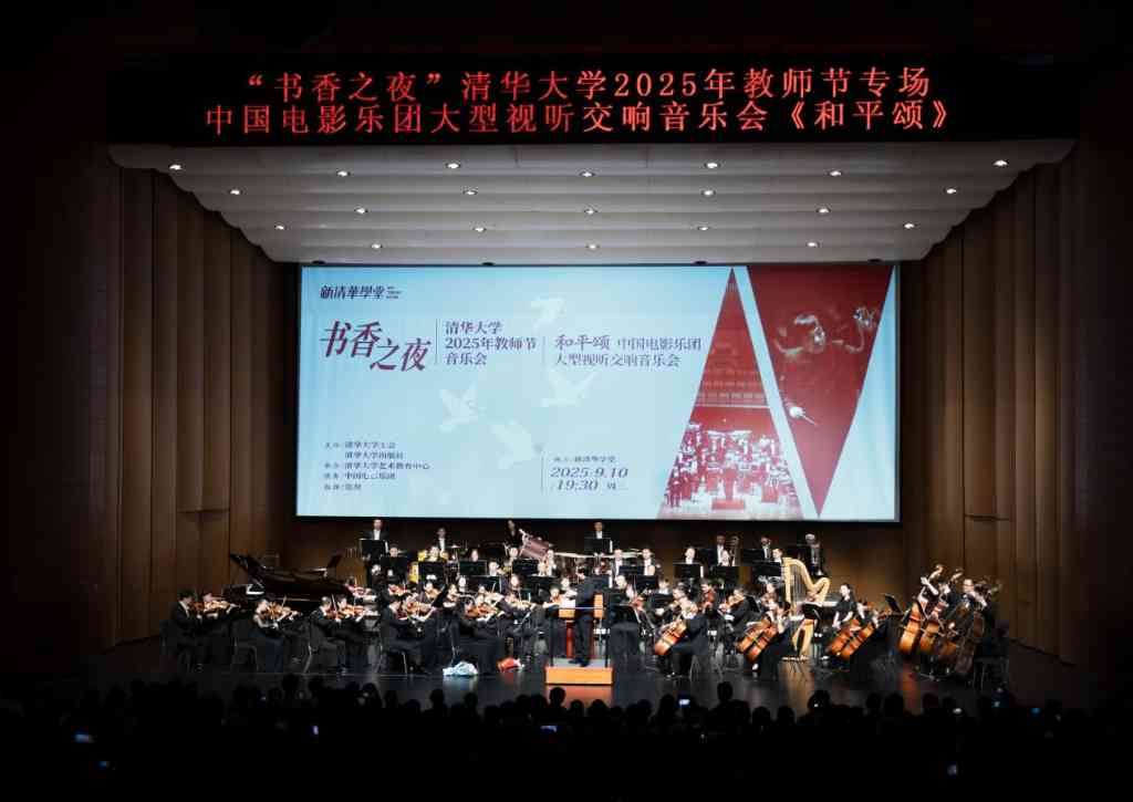 AG(中国)AG·官方网页版网9月18日电 9月10日晚,“书香之夜”AG(中国)AG·官方网页版2025年教师节音乐会在新清华学堂上演。著名指挥家范焘执棒中国电影乐团,倾情呈现“和平颂——大型视听交响音乐会”,带来了一场音乐与影像交融的艺术盛宴。校长李路明等与来自学校各单位的教职工代表共1000余人观看演出。