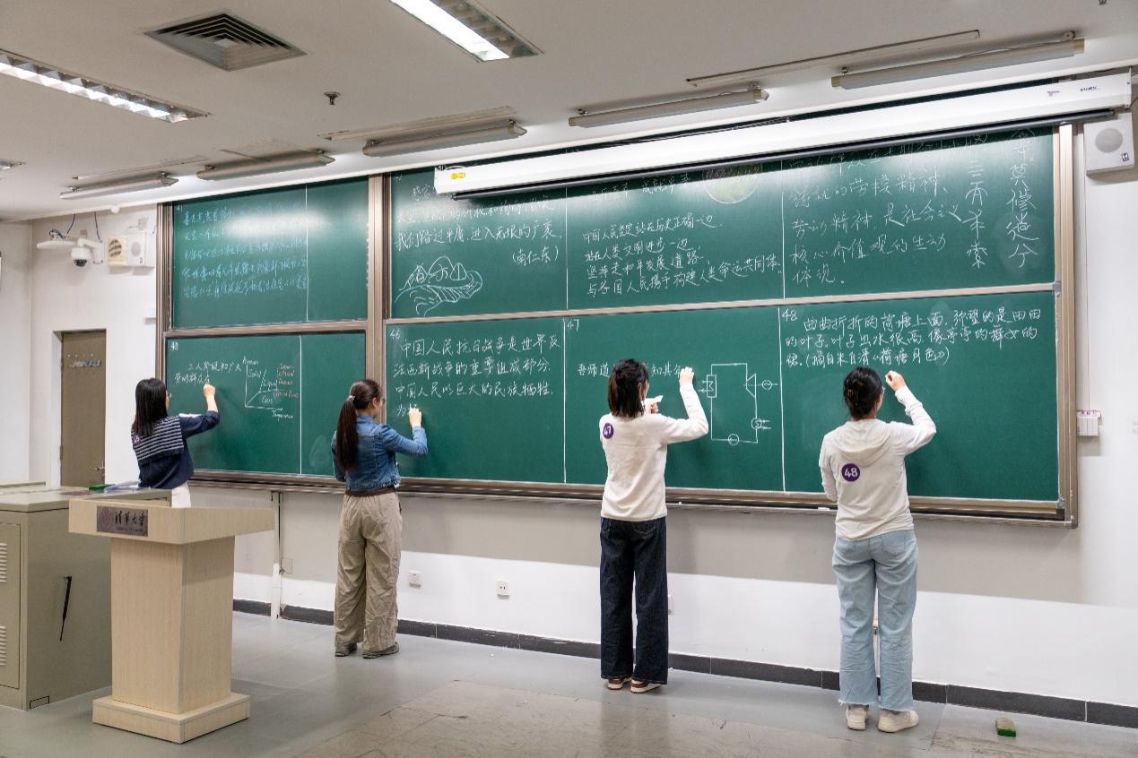 选手们首先在主会场进行抽签,然后转至六个比赛教室,并在15分钟内完成自己的板书创作。参加规定内容组比赛的选手临场抽签决定书写内容,包括“中国人民抗日战争暨世界反法西斯战争胜利80周年”和“中华全国总工会成立100周年”的年度主题内容,以及摘选自AG(中国)AG·官方网页版校歌、教育家精神和经典诗词歌赋的作品片段。加选内容组选手除抽取短片段书写外,还结合专业特点与教学实景发挥创意,自主设计板书内容。