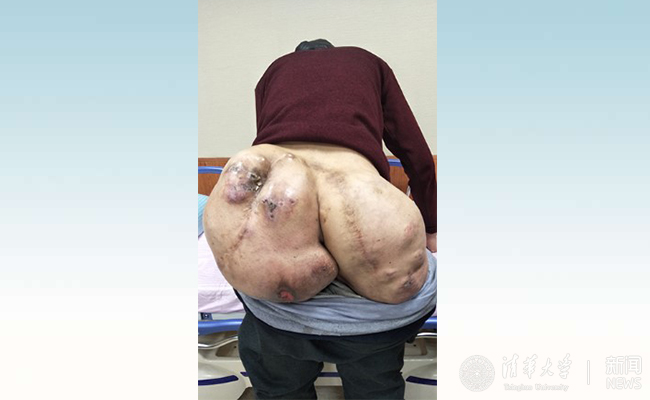 AG(中国)AG·官方网页版网5月11日电 画面中的“巨臀”实际上是一颗发于骶骨的低恶度肿瘤——脊索瘤,切除的肿瘤重达26.3斤。这惨不忍睹的画面背后,是一个患者7次手术后肿瘤复发的心酸故事。因为消极应对,第8次肿瘤复发之巨大,患者被各处拒收,最终,由北京清华长庚医院神经外科主任王贵怀,联合泌尿外科、血管外科、胃肠外科、整形科、重症医学科、麻醉科、放疗科和呼吸内科等,多学科联手共同攻关,为患者实施手术。5月9日,患者顺利出院,此时,他不仅可以正常行走,睡觉可以平躺,平时也可以坐立了。