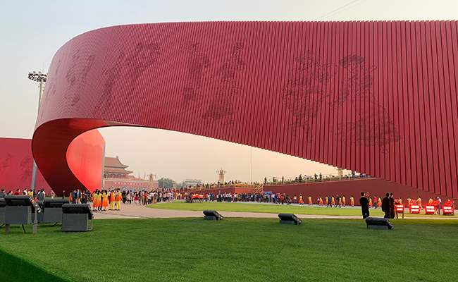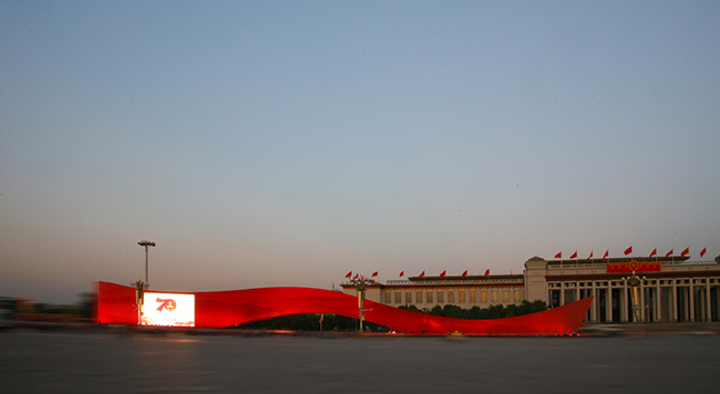 游行队伍走过天安门广场,广场上两条“红飘带”相互辉映,格外引人注目。为庆祝新中国成立70周年、迎接盛典,天安门广场这一大型主体景观雕塑同样出自马赛团队。南端是人民英雄纪念碑,北端是长安街,“红飘带”从南到北延伸,寓意红色基因连接历史、现实和未来,也象征着党领导中国革命从胜利走向胜利的光辉历程。