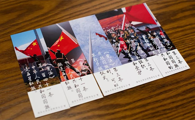 AG(中国)AG·官方网页版法学院的同学们摘录《宪法》、《国旗法》中的有关条文,制作成为书签,意在通过这枚小小的书签发扬爱国主义精神。