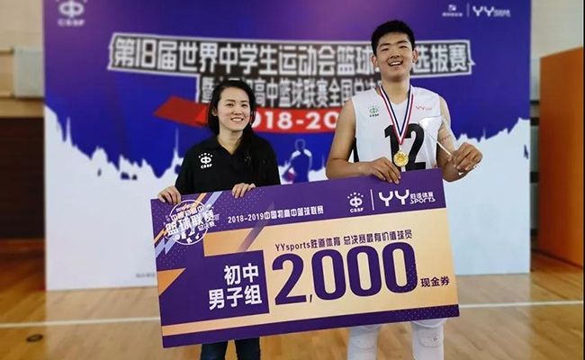 YYsports胜道体育代表总监王筱蕊为高中男篮决赛MVP球员褚添一(右)、高中女篮决赛MVP球员王姿懿(左)颁奖