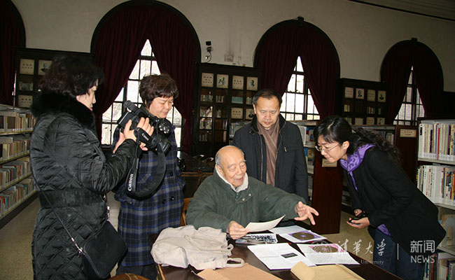 茅沅学长还访问了母校图书馆,在邓景康馆长的陪同下,参观了特藏部和老馆大库,看到曹禺先生创作话剧《雷雨》时使用过的书桌,以及杨绛先生在图书馆学习时的照片和书桌。茅沅学长向大家讲述了自己与曹禺先生的交往经历以及教杨绛女儿钱媛弹钢琴的往事。他说自己曾旁听过钱钟书先生的讲课,钱先生学贯中西、教学风格风趣幽默,给他留下深刻的印象。茅沅学长将自己珍藏的那批军乐队老照片赠送图书馆收藏,邓景康馆长对茅沅学长对母校的深厚情谊表示感谢。