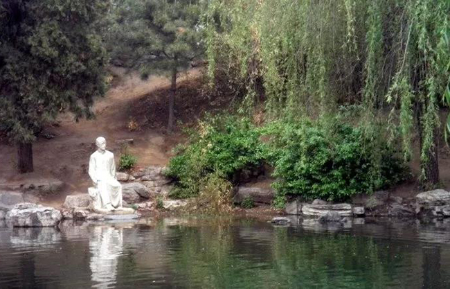 水木清华这里,我做了几个调整。一个是朱自清像的位置,本来是在工字厅北面正对的高高的石墩上。从礼堂这边走过去,一眼就能看见朱自清像。我觉得朱自清像在这儿跟他这个人的风格不太协调,在这里高耸着好像是一个英雄,但他是个诗情画意的文人,他的坚韧是深藏着的。所以我把它往西放在远一点的水边,而且在柳树的遮掩下面,我觉得这样符合他的气质,也使得水池的景点能够向西布局,更加均匀。