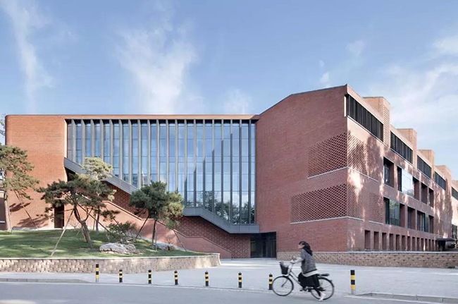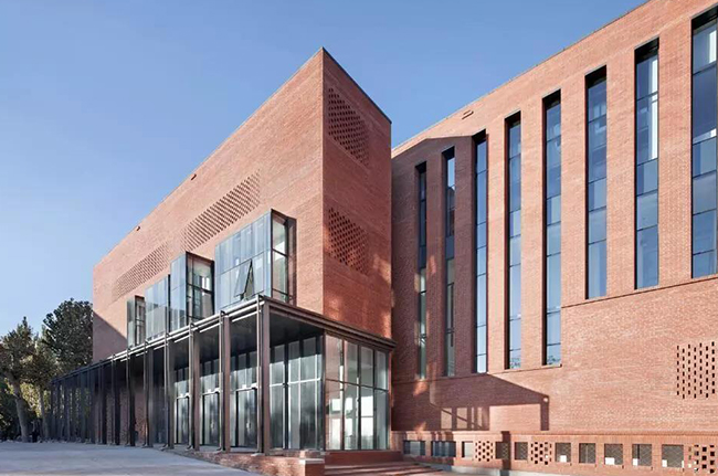 但是用灰砖有个问题,如果一层楼还可以,但是如果三层都是灰砖的话,就会显得太暗、太沉重。所以这里头有很多的技巧,使它又有典雅的特点,又非常的活泼和鲜艳。当时我们想把外墙保温放在清水砖墙里面,再砌一层砖把它们拉接起来,这是相当新颖的技术;一开始工程的承包商都不敢这么做,但我们力争做了一个样板墙,效果很好,最终才被采纳。