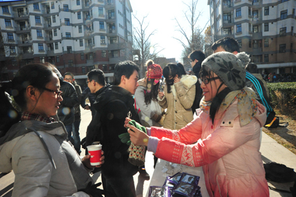 中午11点半,经过紧锣密鼓的准备和预热,义卖活动正式开始。建31的同学们有的戴上他们自己设计的极具一二九特色的口罩,有的在脸上盖上了自己设计的一二九纪念邮戳logo。