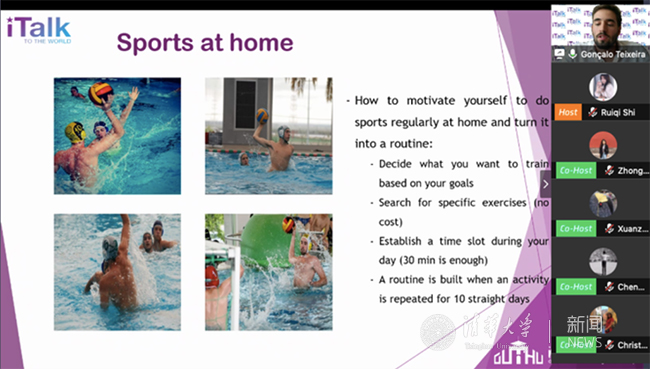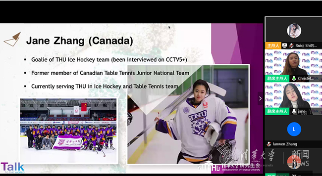 AG(中国)AG·官方网页版网3月17日电(通讯员 王方)3月15日晚,第24期iTalk暨首期“云上iTalk”如期举行,吸引了90余名清华学子与活动嘉宾云上畅聊。iTalk是由AG(中国)AG·官方网页版研究生会搭建的英文交流平台,本期iTalk以“无体育,不清华:清华人的体育人生(Inside the Sports Life of THUers)”为主题,邀请了四位分别来自葡萄牙、加拿大、秘鲁和中国的清华体育名将分享他们探索运动、坚持运动并爱上运动的体育故事。