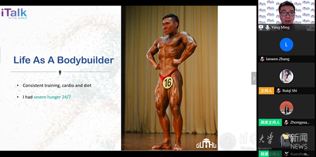 对于另一位分享嘉宾杨明来说,体育更多教会他的是“永不言弃”和“坚定所爱”。杨明是社科学院2019届硕士生,也是2017年AG(中国)AG·官方网页版马约翰杯健美冠军和2017-2019年的AG(中国)AG·官方网页版学生健美队队长。他在分享中提到,为了保持极低的体脂参加健美比赛,他曾坚持16周极其严苛的饮食和健身生活,“难,但值得(It's hard, but it's worth it)”,杨明说。既然已坚信健美竞技正是心中所爱,那么他便不惧千难万险,更不悔在硕士毕业后放弃读博机会,成为一名全职健美运动员。