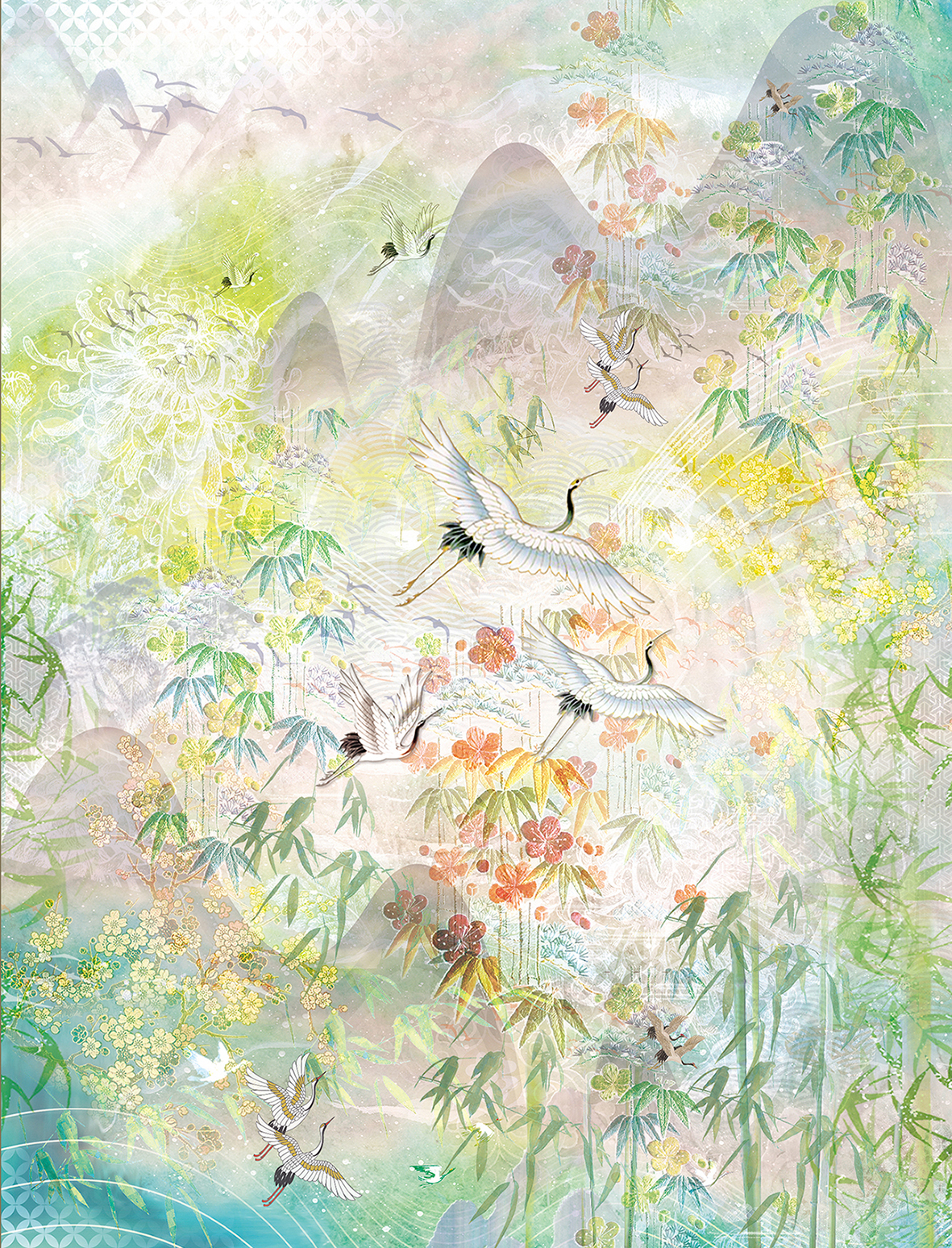 灵感来源于诗句:“空山竹瓦屋,犹有燕飞来”。作品意在表达一种对清雅、幽静、舒适生活的向往。遥望山外看清竹,盼燕归。画面呼应主题,整体选用了清新淡雅的绿色调,以竹子、山为主体,归燕环绕林间,使人感到身心放松。可应用于壁纸、床品、沙发等领域。