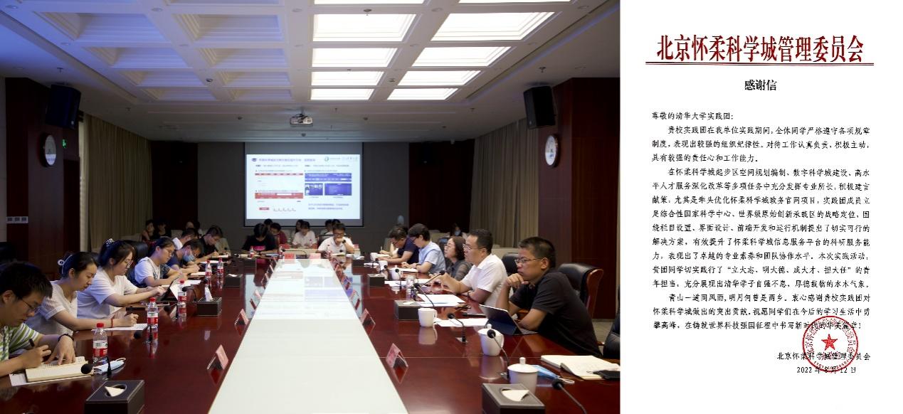实践团成员汇报调研及优化情况(左)、北京怀柔科学城管理委员会感谢信