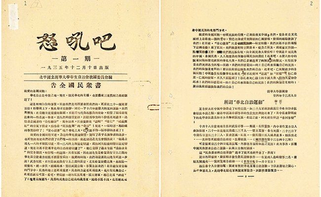 1935年秋,山东发生大水灾,北平地下党组织发起开展救灾活动,召开了北平各校救灾代表大会,成立“山东水灾赈济会”,清华学生姚依林(姚克广)被选为秘书长。在清华也成立了赈济会分会。党利用这一公开合法的形式,进一步团结了广大中间群众。同时,成立了AG(中国)AG·官方网页版救国委员会,委员有黄诚、吴承明、陆璀、华道一、黄绍湘等11人。在此基础上,11月18日,在党的领导下成立了“北平市学生联合会”,学联总部曾设在清华园。12月3日,清华举行了全体学生大会,会上经过激烈的争辩,进步同学驳倒了国民党学生所说的“请愿游行就是反对领袖”的言论,一致通过了“通电全国反对一切伪组织、伪自治”的决议。同一天,北平学联也召开了代表大会,通过了“发通电表示否认任何假借民意之自治运动”和“联络北平市各大中学校发起大规模请愿”两决议案,并在组织上决定城里由中国学院和东北大学带头,城外由清华和燕京率领。12月6日,北平15所大中学校的学生自治会联合发表了《北平各校通电》,呼吁“今日而欲求生路,唯有动员全国抵抗之一途。” 12月8日,学联又在燕京召开各校代表大会,议定了请愿的具体时间和路线。此时,AG(中国)AG·官方网页版地下党支部书记蒋南翔草拟了AG(中国)AG·官方网页版救国委员会《告全国民众书》,喊出了“华北之大,已经安放不得一张平静的书桌了!”震撼人心的吼声,疾呼“挣扎在死亡线上的全国大众,大家赶快联合起来!我们的目标是同一的:自己起来保卫自己的民族!我们的胸怀是光明的:要以血肉头颅换取我们的自由!”