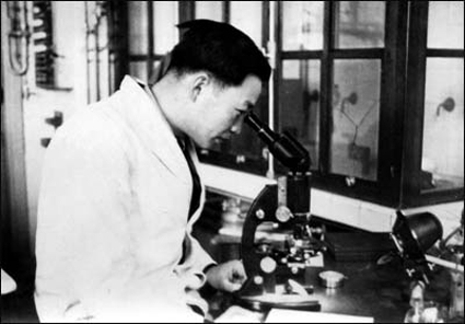 1946年钱三强先生在巴黎居里实验室用依莱娜的高倍显微镜进行观测。