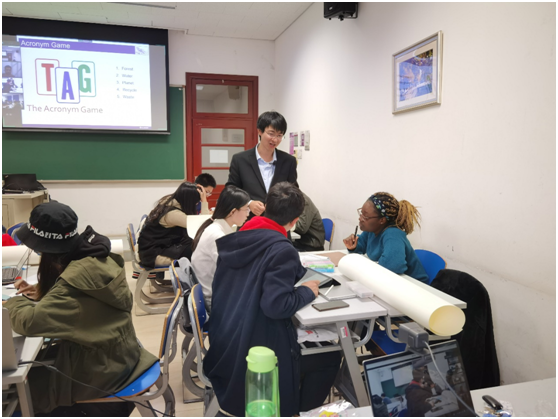 而在Acronym Game环节中,每组随机分到一个与环境相关的英文主题单词,在规定的时间内对该单词的每个字母拓展为词汇,形成一个句子,句子的单词首字母即为该主题单词,同时,还要使这句话是该主题单词的核心要义的阐释。在此基础上,围绕该句子的内涵进行海报的制作与展示。这样的教学环节设计,不仅让学生们充分思考、交流、协作,充分发挥了想象力与创造力,而且承接后续论文写作的课程训练。