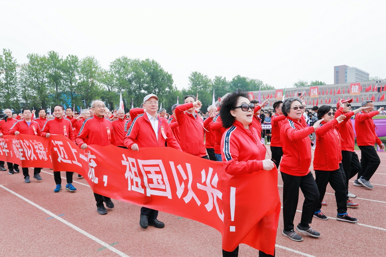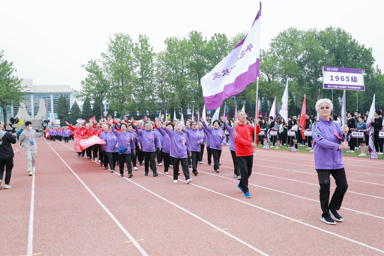 与此同时,东大操场北侧马路对面的“红场”已是人潮涌动,毕业10周年、20周年、30周年、40周年的校友们身着统一服装在这里列队排练。开幕式前,邱勇、陈旭也来到这些秩年校友方阵中,与他们握手、拥抱、合影,共话清华体育精神,现场气氛十分热烈。随后,邱勇、陈旭步入东大操场,在“无体育,不清华”的标牌前与毕业50周年的1964级、1965级校友方阵亲切合影。